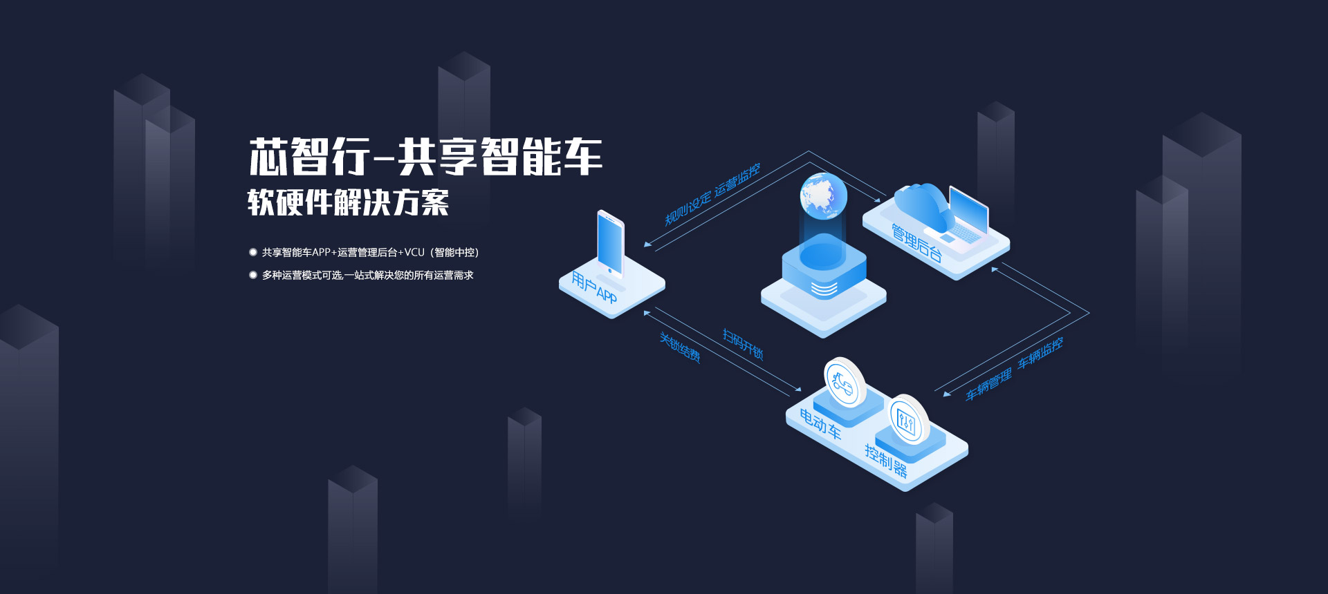 共享智能車APP + 運營管理后臺 + VCU(智能中控)= 一站式解決方案